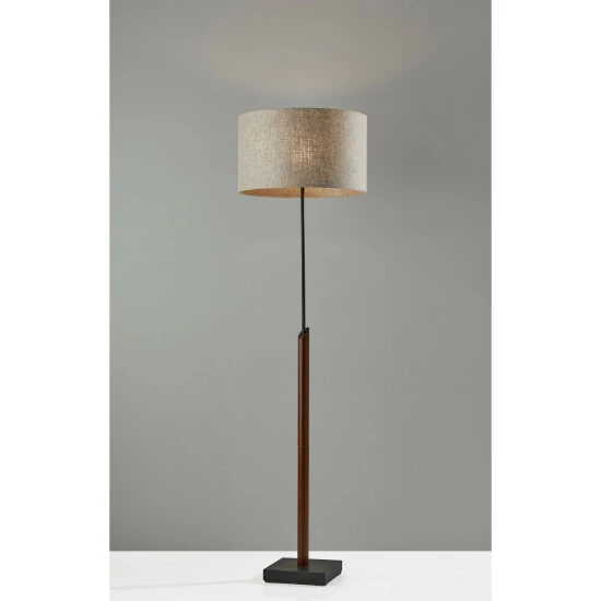 Crafted from walnut wood and black metals, this Floor Lamp is a versatile mid-century modern style that looks good in any space. A natural textured fabric shade balances out the look. With a 10″” square base, this lamp has a compact profile to sit wherever light is needed. A black fabric covered cord comes out elegantly from the base. Bulb is not included.