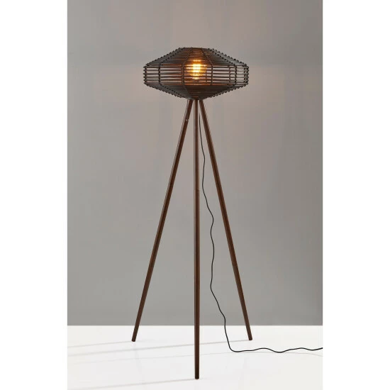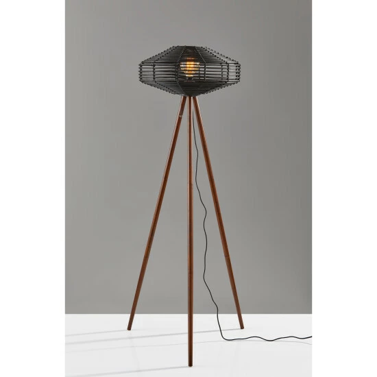 A stunning mix of natural materials, this Floor Lamp is a great way to add some bohemian inspiration to a modern setting. A black rattan disc houses a globe shaped vintage bulb that is included with this shipment and adds even more decorative appeal to the look. Rich, walnut wooden legs provide a sturdy tripod construction. A black fabric covered cord neatly hangs down from the socket. Turn the lamp on and off using a simple pull chain switch.