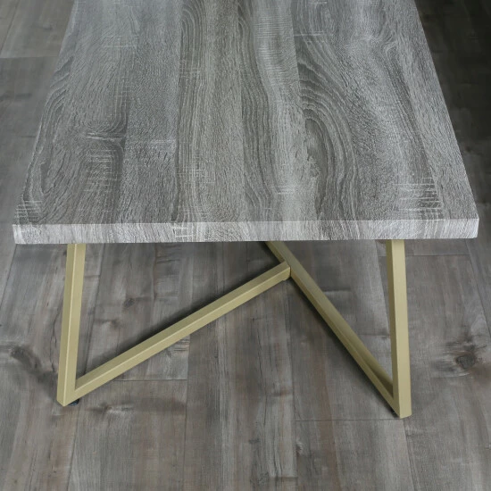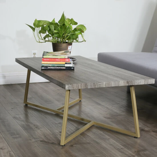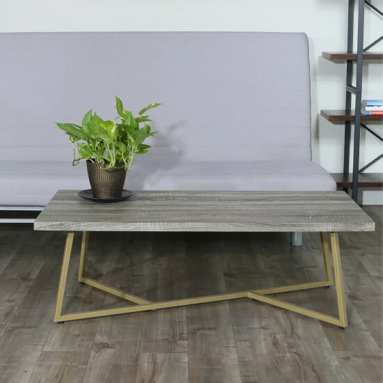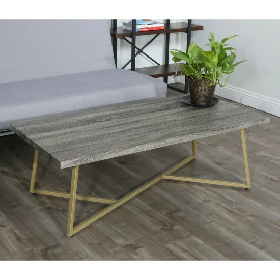 Update your home with this rectangular coffee table. This table boasts a modern and contemporary style and features a metal frame finished in a gold color. It also has an X-shaped base with clean lines for a touch of contemporary appeal, while walnut hues allow it to blend with a elegant, mid-century modern design style.