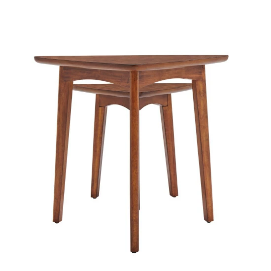 Put the finishing touch on your mid-century modern living room overhaul with this pair of nesting end tables. The gently curved triangular tabletops paired with tapered legs bring the classic, comfortably relaxed look you’re after, and the warm chestnut finish lends richness. Nylon floor protectors help prevent scratches as you slide these nesting end tables in and out of position. This two-piece table set made from durable and sturdy pine wood comes with all the tools and hardware you need for a quick, hassle-free assembly.